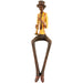 A sitting jazz man, playing the trumpet. Part of the 'Sitting Jazz Band' collection. He has a plat surface, with one hanging leg so it can sit on the edge of a surface. This item is suitable for display as an orenament.